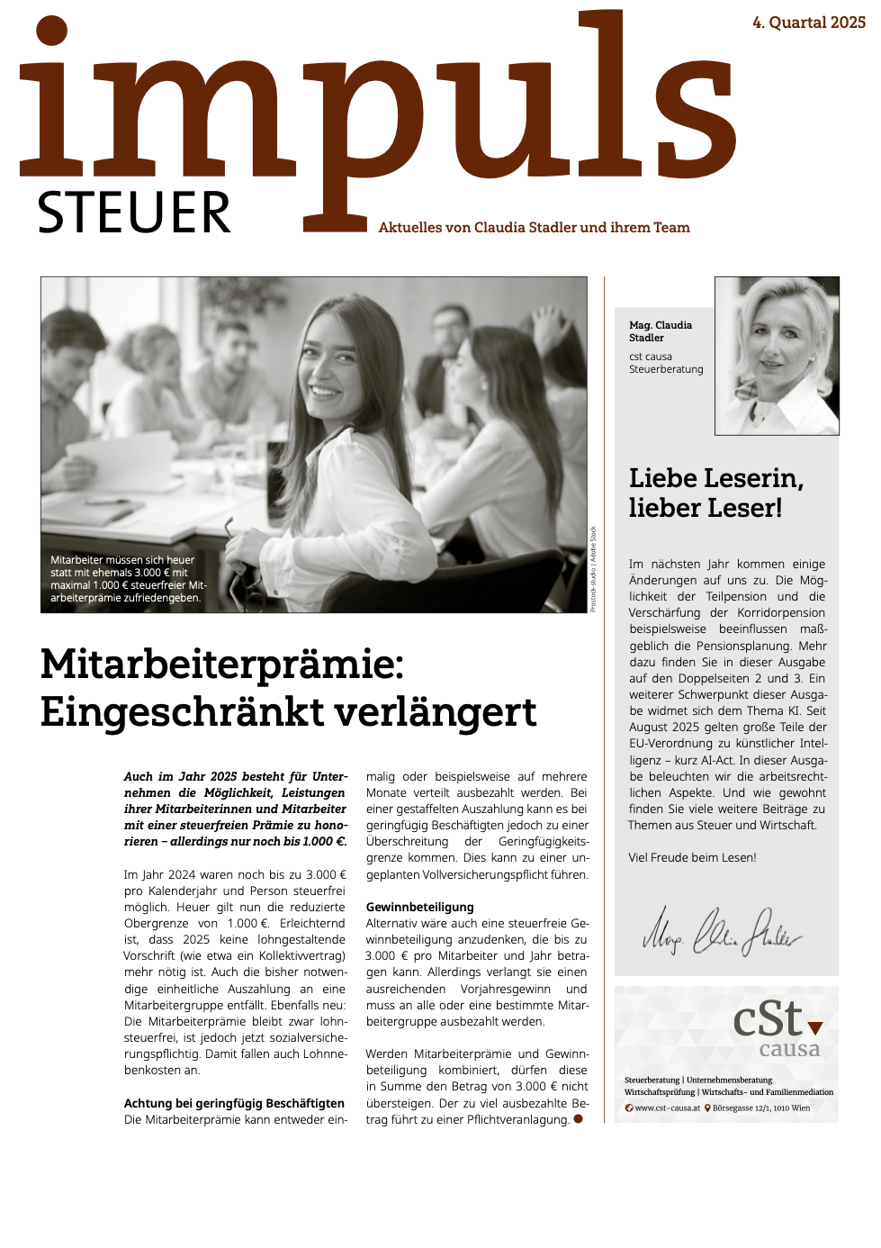 Unser Klientenmagazin „Impuls“ erscheint 4 x jährlich und informiert Sie laufend über Aktuelles aus den Bereichen Steuer, Finanzen, Sozialversicherung, Dienstnehmer, Jungunternehmer, Recht, Immobilien, Familie und vieles mehr.
